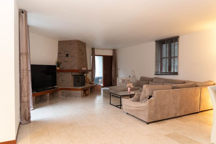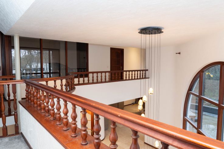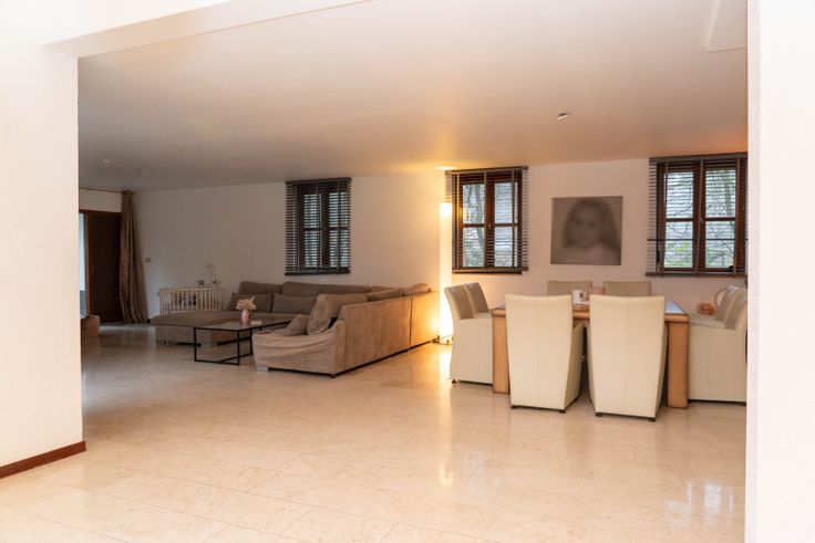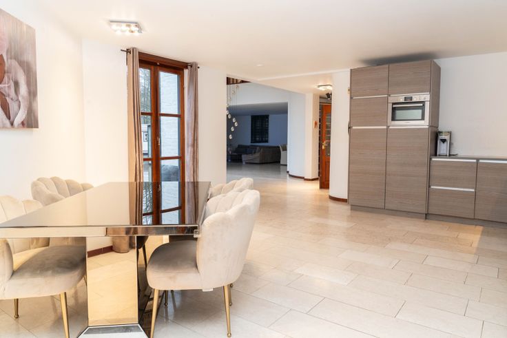 U wordt verwelkomd in een stijlvolle inkomhal met gastentoilet en vestiaire. De ruime woonkamer straalt warmte uit met een open haard, grote raampartijen en een marmeren vloer. De keuken, vernieuwd in 2017, is uitgerust met moderne apparatuur en een prachtig uitzicht op de tuin. Daarnaast biedt de gelijkvloers een praktische bureauruimte, die ook als berging kan dienen.