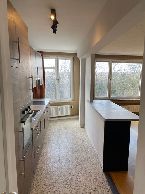 Appartement lumineux fraichement rénové, 10min du centre ville, proche de toutes commodités, accès autoroute rapide comprenant: grand séjour, cuisine ouverte, salle de bain, wc indépendant, chambre principale et petite chambre/bureau, nombreux rangements Vue dégagée et possédant une petite terrasse arrière, parking aisé. Parc de Xhovémont et plaine de sport proche