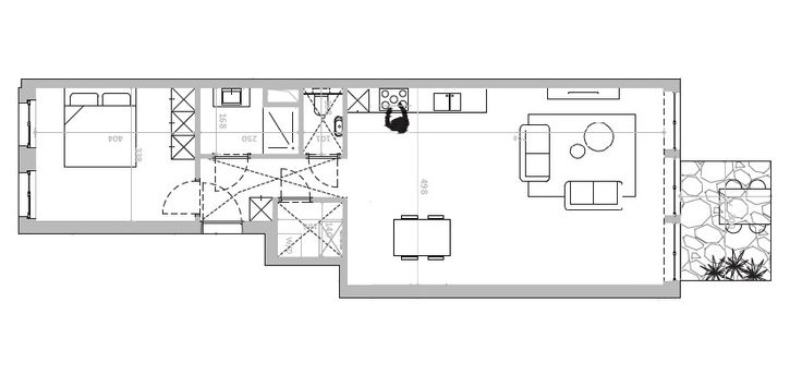 Indeling appartement: Inkom naar zalig ruime en lichte leefruimte met keuken, eetkamer en salon. De 5m brede leefruimte geeft uit op het terras. Mooie slaapkamer, badkamer met inloopdouche. Apart toilet.