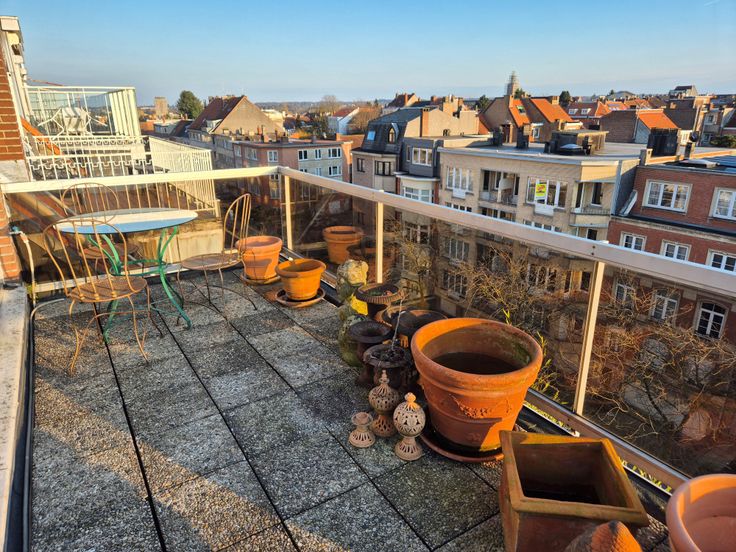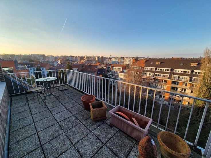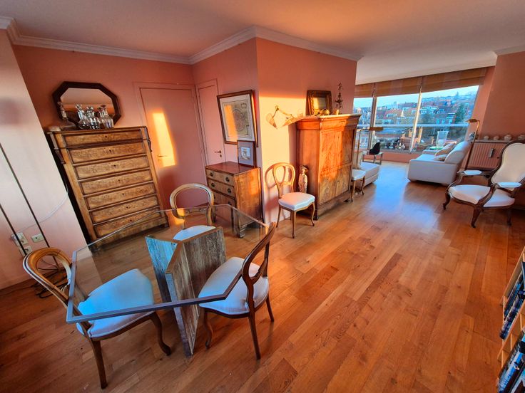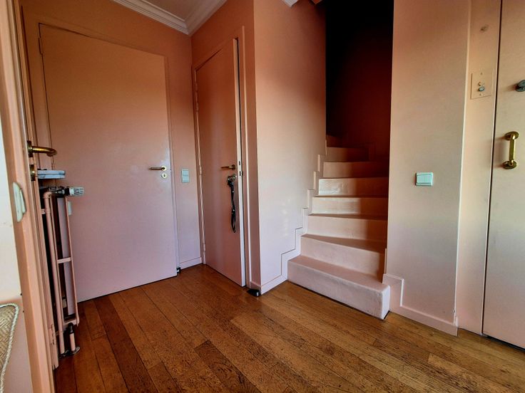 Deze duplex bevindt zich op de 6e verdieping van een goed onderhouden flatgebouw en is bereikbaar via de trap of via de lift die rechtstreeks naar de flat leidt. Het bestaat uit een hal met aparte vestiaire, een lichte woonkamer met parketvloer en toegang tot het terras aan de voorkant, een eetkamer, een doucheruimte omgebouwd tot opslagruimte, een half ingerichte keuken met toegang tot een tweede groot terras en een apart toilet.