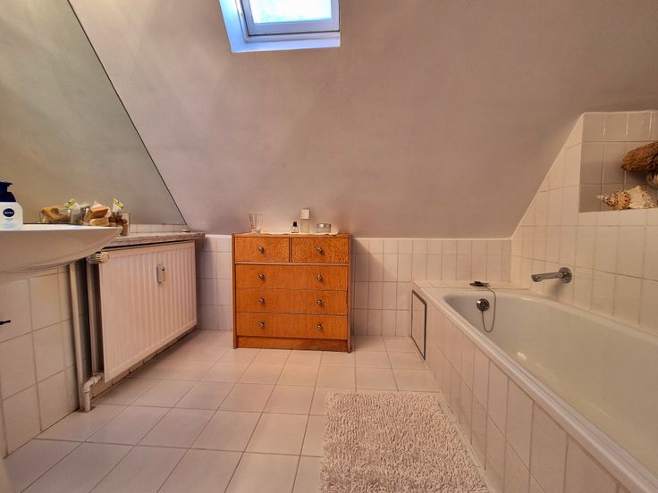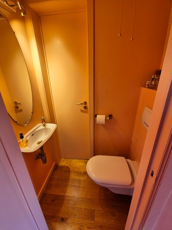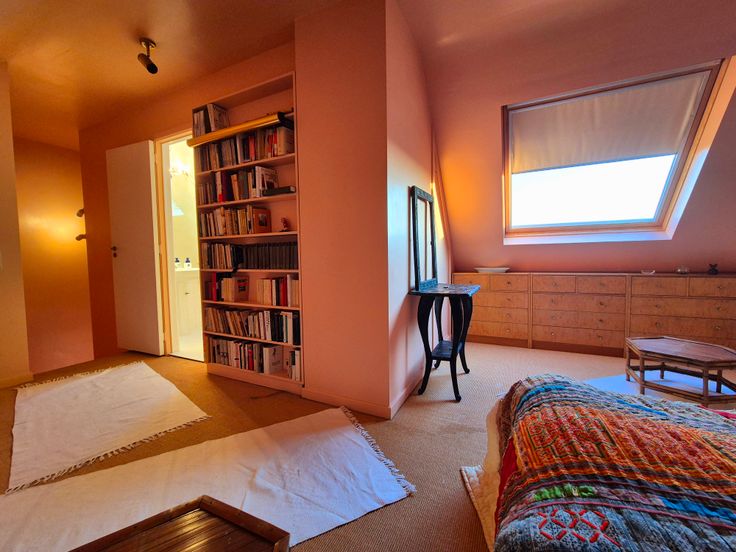 De tweede verdieping van dit duplex appartement heeft een badkamer en een grote slaapkamer met ingebouwde kasten.