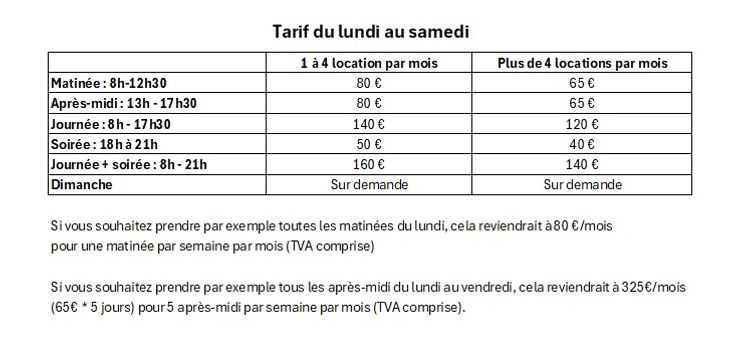 Le loyer est à partir de 110 €/mois pour 4h de présence hebdomadaire et ce montant inclus le chauffage, internet et l'électricité.