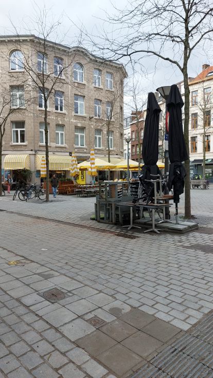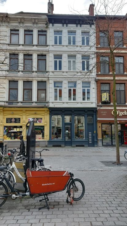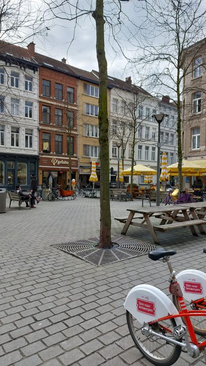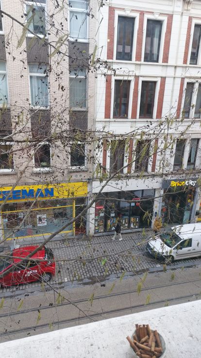Ligging: zicht vanuit living op Nationalestraat, bij gezellig pleintje, vlakbij allerlei winkels, cafés, restaurants, openbaar vervoer en Groenplaats, Lombardevest, Tropisch Instituut, Meir enz...