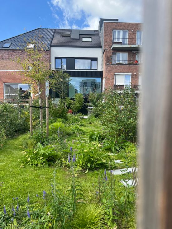 -Een extra troef is de klimaatbestendige, biodiverse tuin, met 2 terrassen in gepolierd beton (een grenzend aan het huis en een achteraan het perceel).