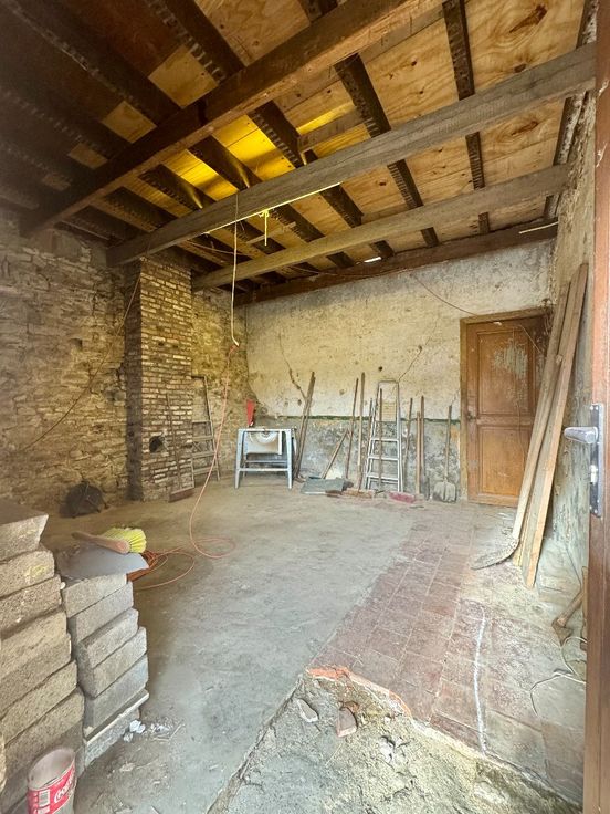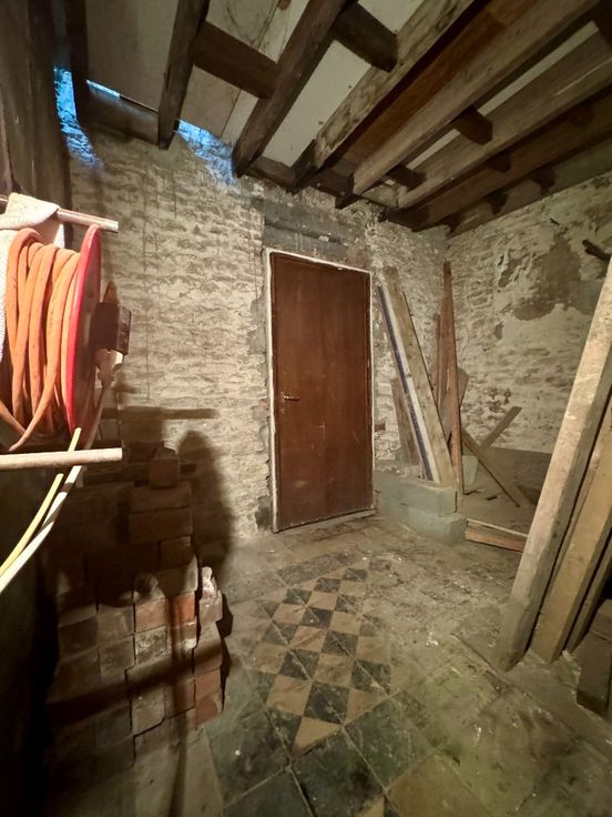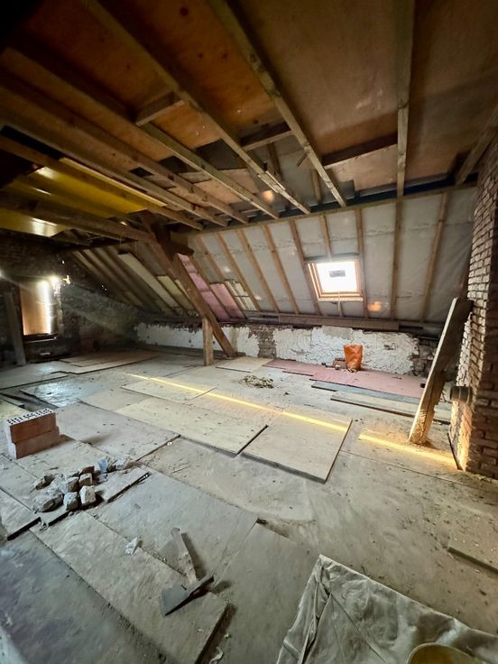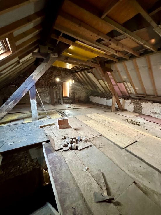 Laat je creativiteit de vrije loop! Mogelijkheden: een salon van 16m² , daarnaast een eetkamer van ongeveer dezelfde grootte. De keuken heeft een oppervlakte van 8m². Achter de keuken bevindt zich toegang tot de gang van 10m², die leidt naar de tuin of naar de ruime garage van 27m². Via een tussenruimte van 9m² bereikt u de bovenverdieping, waar zich een royale zolderruimte van maar liefst 55m² bevindt.
