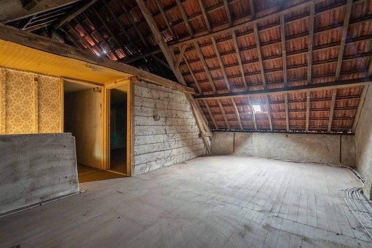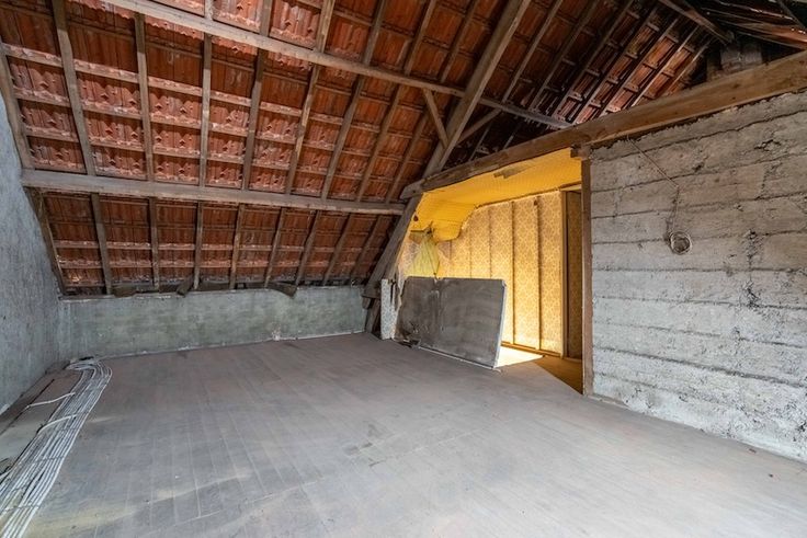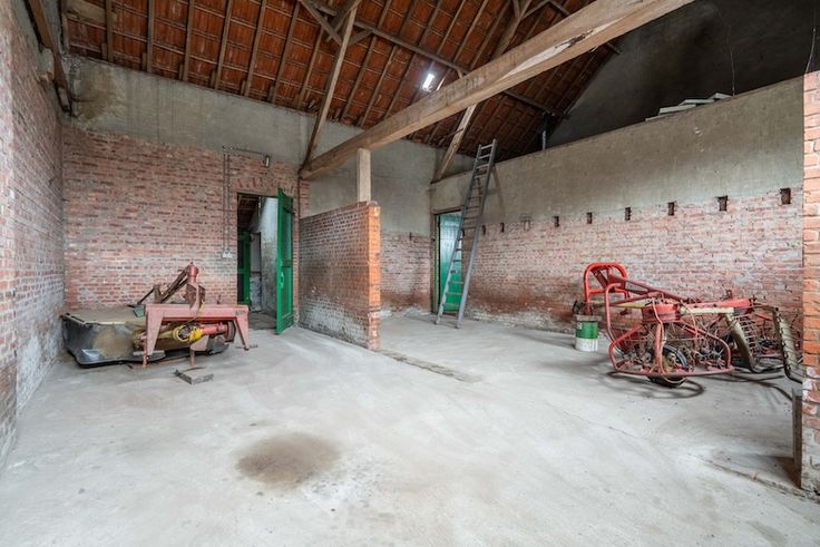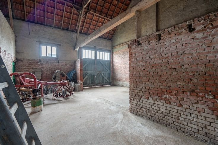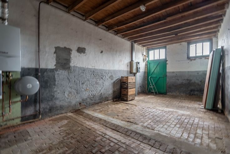 De vroegere garage en stallen bieden heel wat extra ruimte en is open tot aan het dak. Waardoor ook hier het authentieke dakgebinte helemaal zichtbaar is en voor een prachtig karakter kan zorgen bij het renoveren.