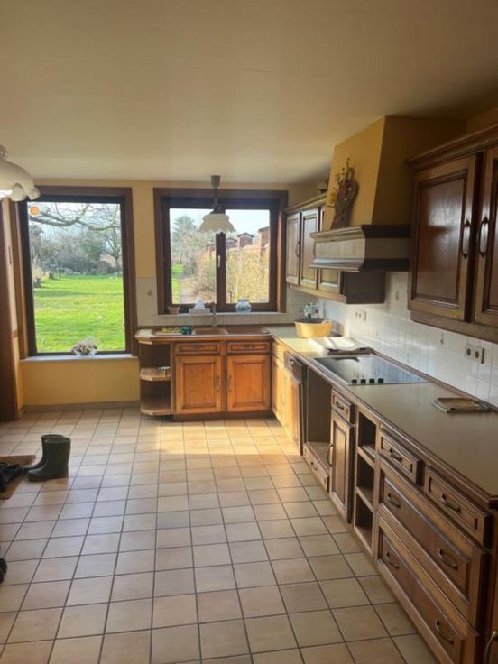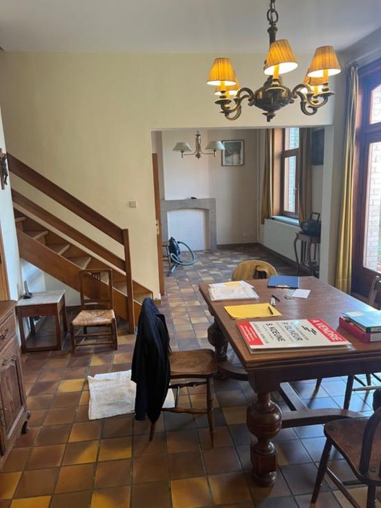 Maison d’habitation style maison de Maître (idéal pour profession libérale) avec garage, jardin et verger comprenant: RDC: hall, salle d’attente, 2 wc, bureau, living, salle à manger, buanderie cuisine semi équipée et 1 salon ETG 1: 4 chambres, 1 salle de bains (2 éviers et 1 baignoire), 1 wc avec douche carrelée ETG2 (mansardé): 3 chambres, 1 bureau et un petit grenier RC:874 € Superficie:17a 95ca Chauffage : central mazout (cuve 5300L) Châssis: double vitrage PVC et bois garage pour 2 voitures avec grenier aménageable Faire offre à partir de 330.000 euros