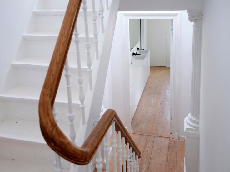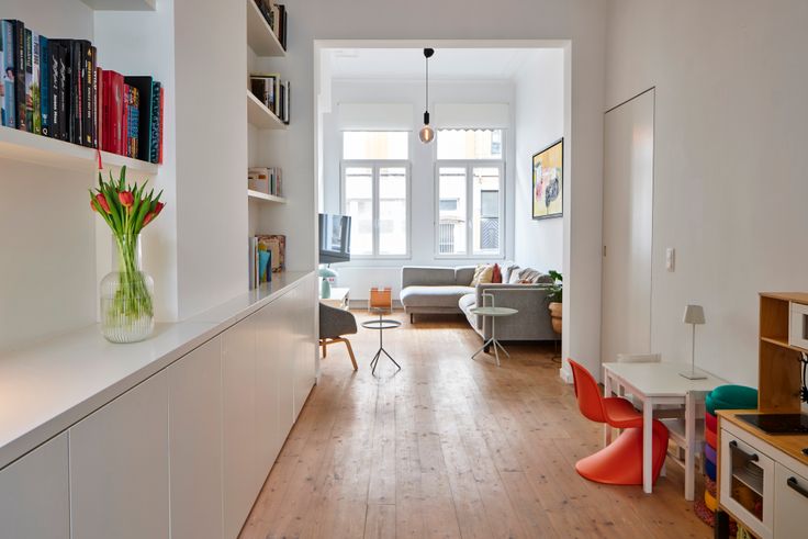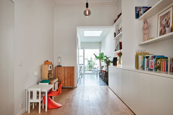 Inkomhal op gepolierde beton, ruime lichte tweedelige leefruimte op houten vloeren met een op maat gemaakte boekenkast tot aan het plafond.