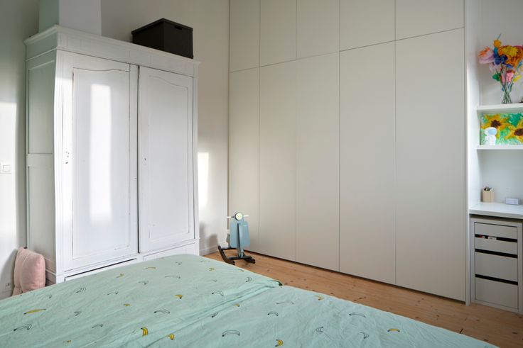2 ruime lichte slaapkamers, de slaapkamer vooraan werd voorzien van maatkasten tot aan het plafond en een maat gemaakt bureau.