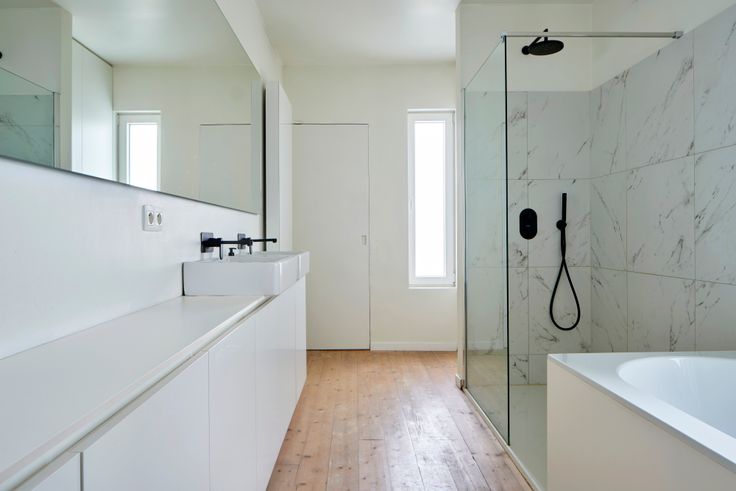 Overloop met inbouwkast met nieuwe condensatieketel. Ruime badkamer met bad en douche. Zowel het badkamermeubel, alsook de inbouwkast met aansluitingen voor wasmachine en droger werden op maat gemaakt, toilet met extra maatkast voor bijkomende opbergruimte.