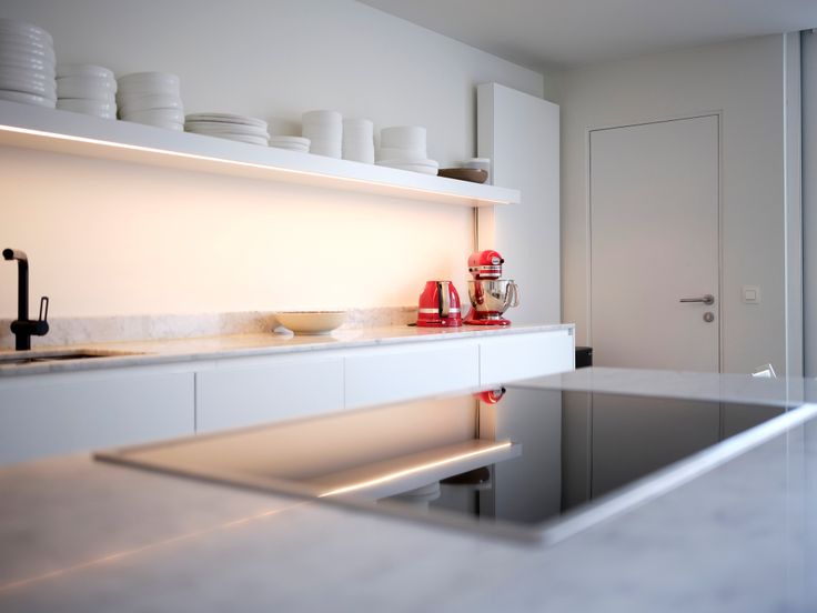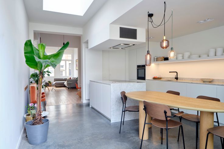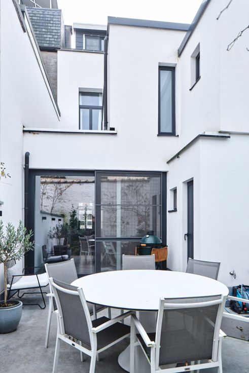 Vernieuwde open keuken op gepolierde beton, kwalitatieve keukenkasten, high end toestellen en Carrara-marmeren werkblad. Een gastentoilet met handenwasser bevindt zich achteraan. Via het grote schuifraam is er toegang tot de zonnige en rustige stadstuin, met praktische berging en aansluitingen voor water en elektriciteit.