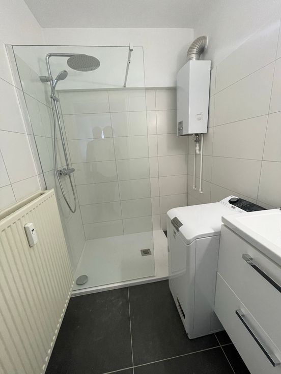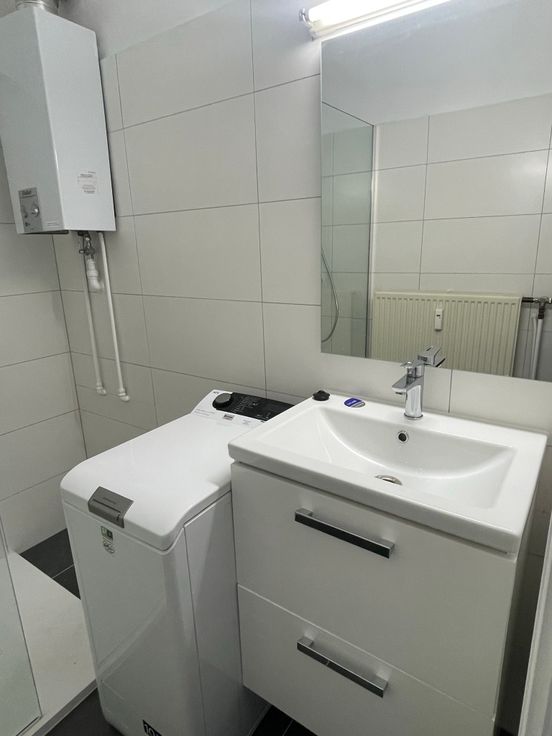 une salle de bain avec emplacement machine à laver,