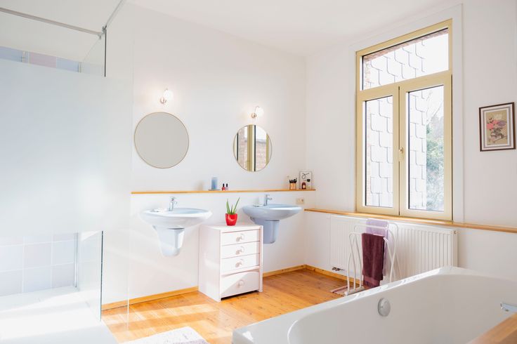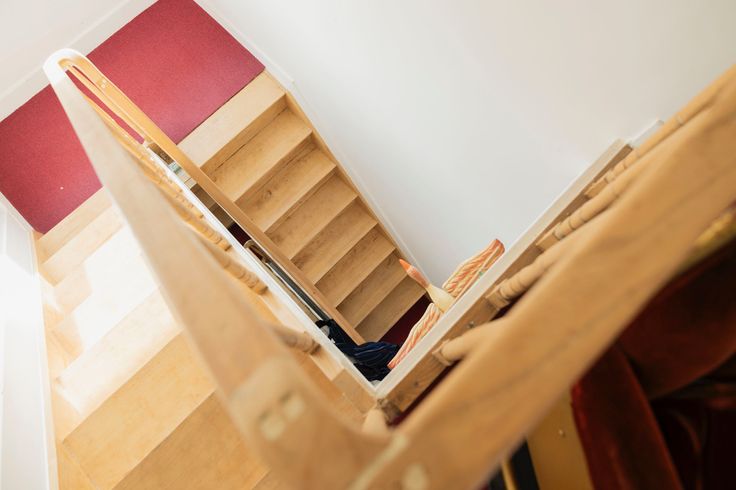 Via de houten trap bereik je op het tussen verdiep de wasplaats/berging. Op de eerste verdieping bevindt zich de eerste slaapkamer, lichtrijke en ruime badkamer met ligbad, douche, lavabo's en tweede toilet.