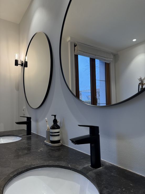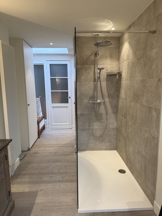 - Ruime, moderne badkamer met grote inloopdouche en dubbele wastafel