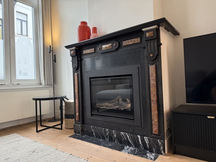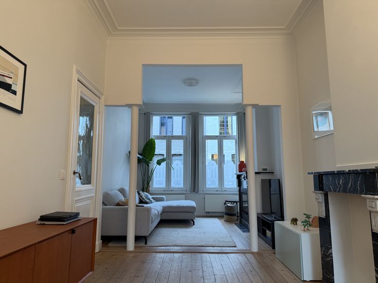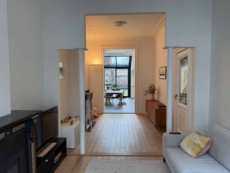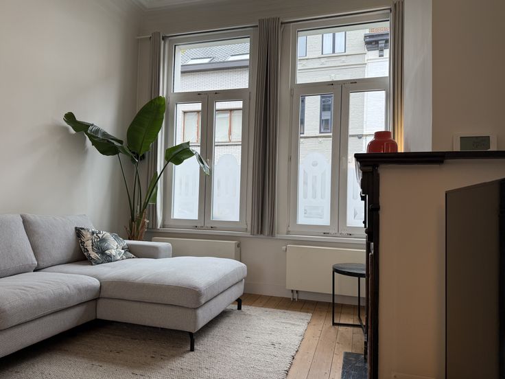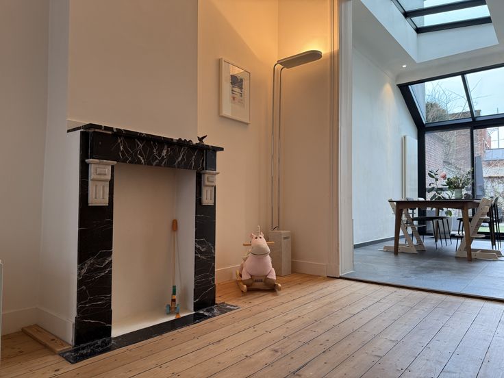 - Ruime, lichtrijke leefruimte met parket, originele schouwen en ingebouwde gashaard voor koude winterdagen