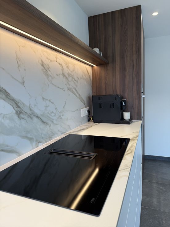 - Recent vernieuwde open keuken met hoogwaardige afwerking, uitgerust met ingebouwde toestellen (vaatwasser, koelkast, diepvriezer, combi-oven, inductievuur) en ingebouwde bergingkast