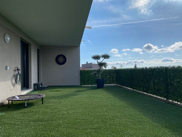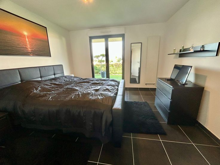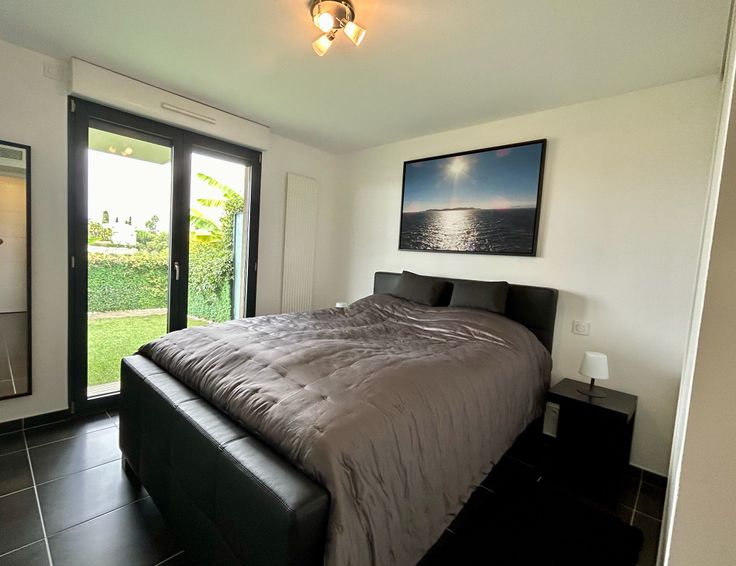 De 3 kamers waarvan 1 suite met aparte dressing geven allen rechtstreekse toegang tot de tuin met kunstgras.