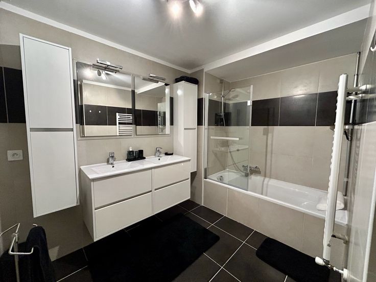 Een badkamer met bad en dubbele lavabo, alsook een douchekamer met aparte toilet en een all-round ruimte zijn aanwezig en in perfecte staat.