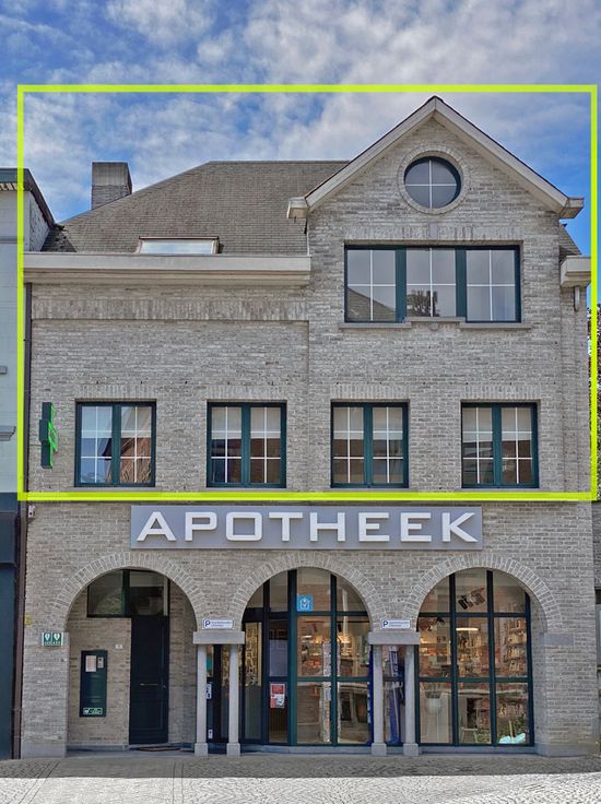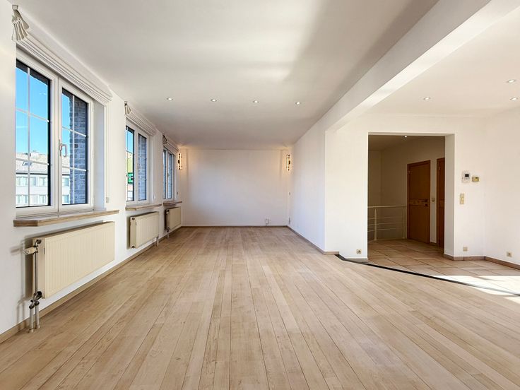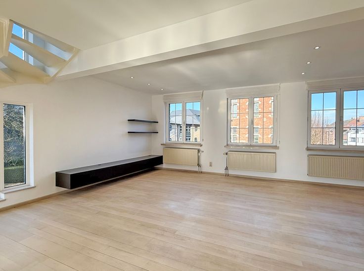 Ruime woonkamer met eiken parket en een schitterend uitzicht op de kerk, die deel uitmaakt van het renovatieproject voor het centrum van Wolvertem.
