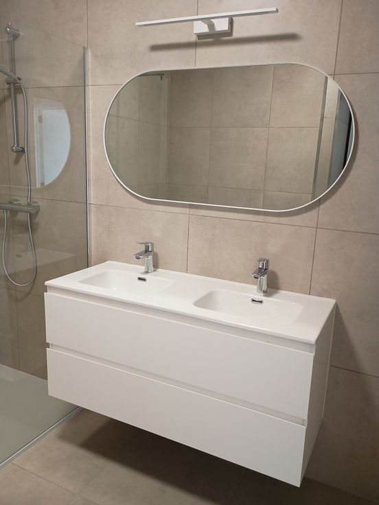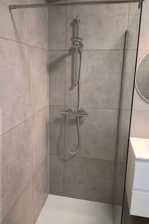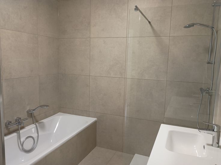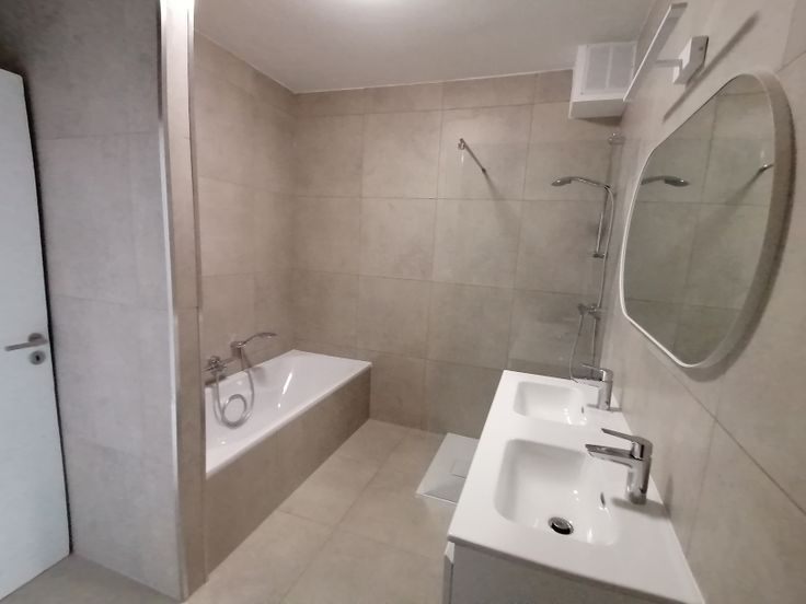 De volledig betegelde badkamer heeft een ligbad, een douche en een dubbele wastafel.