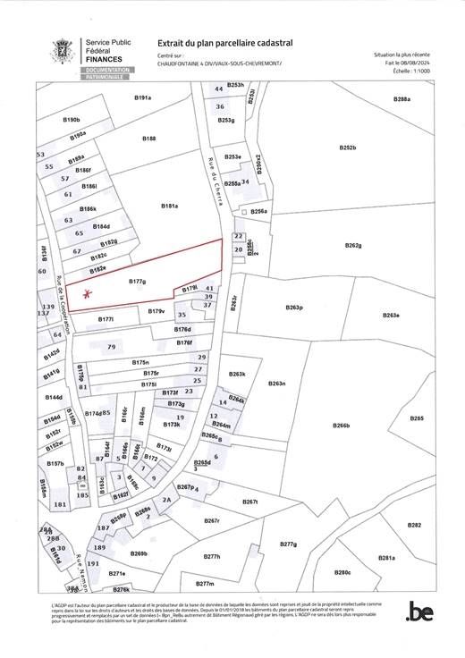 Vaux s/Chèvremont: Terrain plat à bâtir de, d'après cadastre, 1218m² donnant sur deux rues; rue de la coopération (à côté du 67) et rue cherra avec respectivement une largeur de façade approximative de 11m et 13m.
