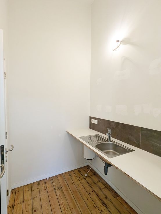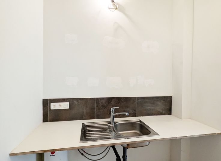 Une petite pièce avec un grand lavabo et un plan de travail