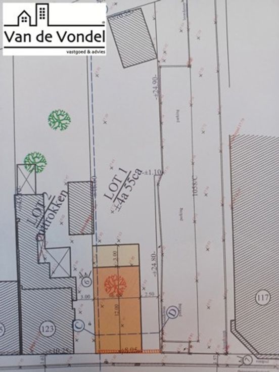 Bouwgrond te Denderleeuw. Perceel bouwgrond met een oppervlakte van 455m² in het centrum van Denderleeuw. Het perceel is geschikt voor het oprichten van een halfopen bebouwing met een gevelbreedte van 6,45m en een bouwdiepte van 15m op het gelijkvloers en 12m op de verdieping. Dit perceel is uiterst geschikt voor het oprichten van een woning met commerciële doeleinden wegens de ruime parkeermogelijkheden naast en recht tegenover het perceel. Voor meer inlichtingen of een afspraak 0497/444201 of info@vandevondel.be