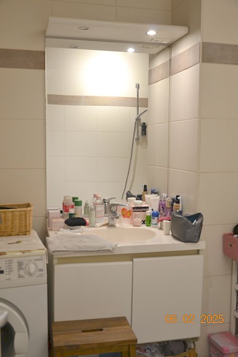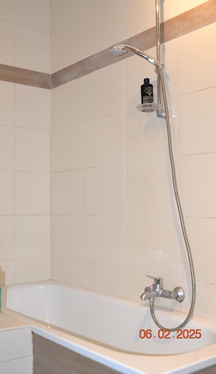 – 1 salle de bain de 2,12 m2 avec un meuble lavabo et une baignoire, arrivée et décharge machine à lessiver