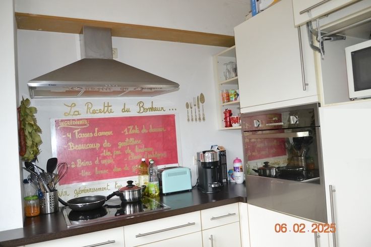 – 1 cuisine de 8,19 m2 + équipée d’un frigo, four, taque vitrocéramique, hotte