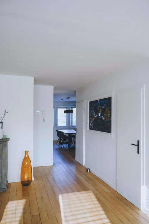 Bij binnenkomst via de privé-ingang wordt u verwelkomd in een ruime inkomhal, ideaal voor het stallen van fietsen, kasten of andere opbergmogelijkheden.