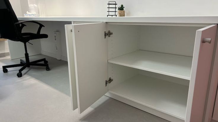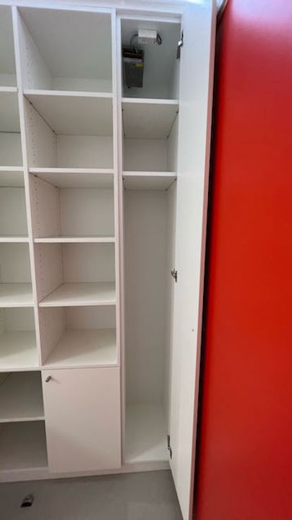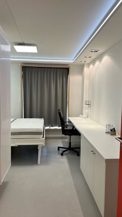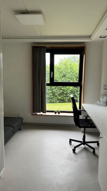 De kamer is modern en functioneel ingericht met een ruime bureau, goed verlicht met plafondspots. Er is heel wat plaats voor boeken en studiegerief in de vaste boekenkast.