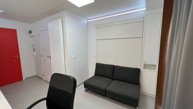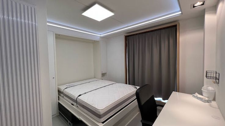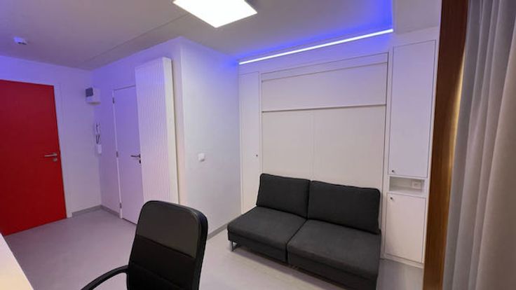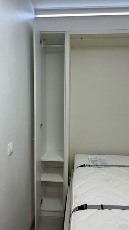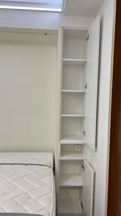 Verder is er een degelijk opklapbed gemonteerd met een zeer degelijke matras (breedte 140 cm). Eens opgeklapt komt een sofa te voorschijn. Links en rechts van het bed is kastruimte gebouwd voor kleding.