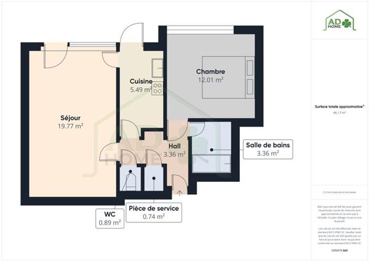 Il se compose d'un hall d’entrée desservant un séjour menant sur un balcon, une cuisine non-équipée, un WC indépendant, un espace débarras, une salle de bains et une chambre à coucher.