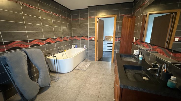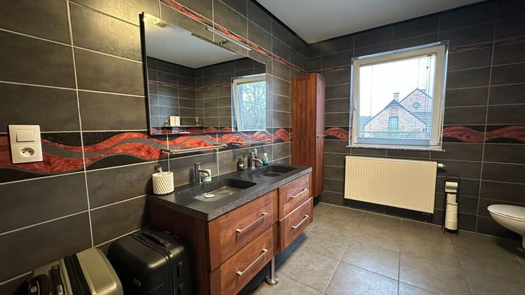 - A l'étage; de 3 belles chambres lumineuses, d'une salle de bains (bain, meuble de rangement, toilette et double vasques) ET d'une salle de douche (douche et vasque).