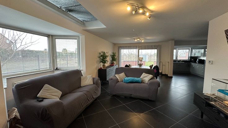 - Au rez-de-chaussée; d'un hall d'entrée, d'un wc indépendant, d'un lumineux living, d'une cuisine hyper-équipée ouverte (réfrigérateur avec congélateur, four, micro-ondes, taques vitrocéramiques, lave-vaisselle, double évier, meubles de rangements,... ), d'une buanderie, d'un garage.