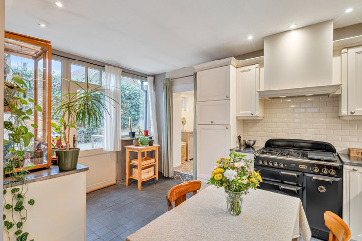 De instapklare woning omvat een gezellige zitkamer met leeshoek, waar de houtstoof zorgt voor een heerlijke sfeer. Aansluitend bevindt zich de volledig uitgeruste keuken, met oog voor detail en kwalitatieve materialen (fornuis als eyecatcher). Dankzij een lichtkoepel baadt deze ruimte in natuurlijk licht, wat het landelijke karakter nog versterkt.