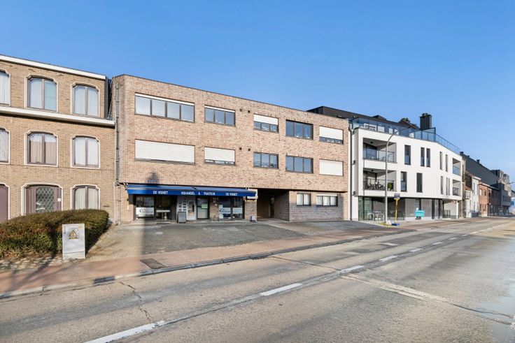 Op het gelijkvloers bevindt zich de handelsruimte waar de huidige huurders een succesvolle viswinkel uitbaten. Bovendien is er een grote parking tegenover het gebouw, een absolute plus voor de klanten. Naast het handelspand bevindt zich het eerste appartement van 50 m², ingedeeld als volgt: inkomhal, leefruimte, kitchenette, toilet, doucheruimte en 1 slaapkamer. Achteraan op de gelijkvloers bevindt zich het tweede appartement van 100 m², ingedeeld als volgt: inkomhal, apart toilet, twee bergingen, badkamer, leefruimte met open keuken en twee slaapkamers. De badkamer en keuken van dit appartement werden recent vernieuwd. De doorgang tussen de viswinkel en het appartement vooraan leidt naar de garageboxen achter het gebouw.