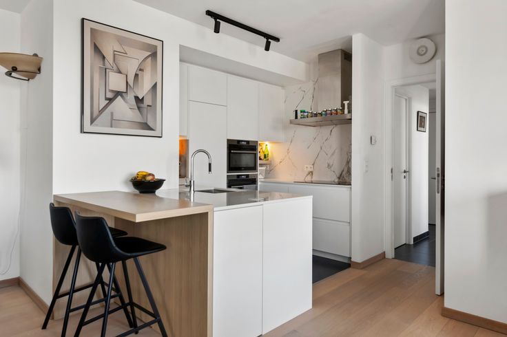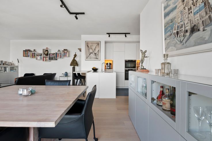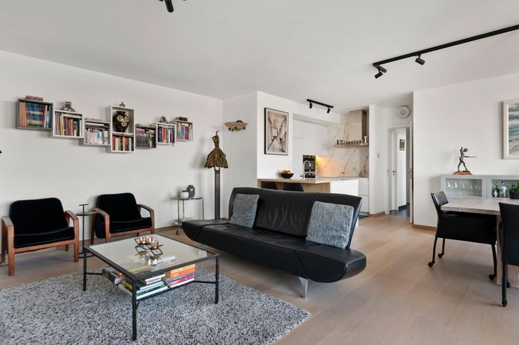 De ruime leefruimte heeft een prachtige opgeschuurde parketvloer, wat zorgt voor een warme en uitnodigende sfeer. De slaapkamers zijn ook voorzien van een parketvloer, wat de stijl door het hele appartement consistent maakt.