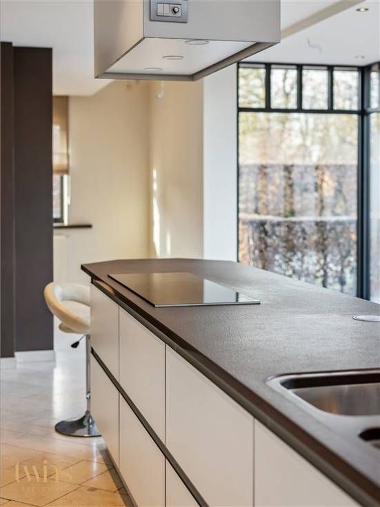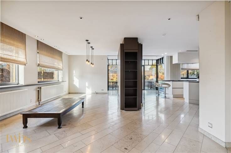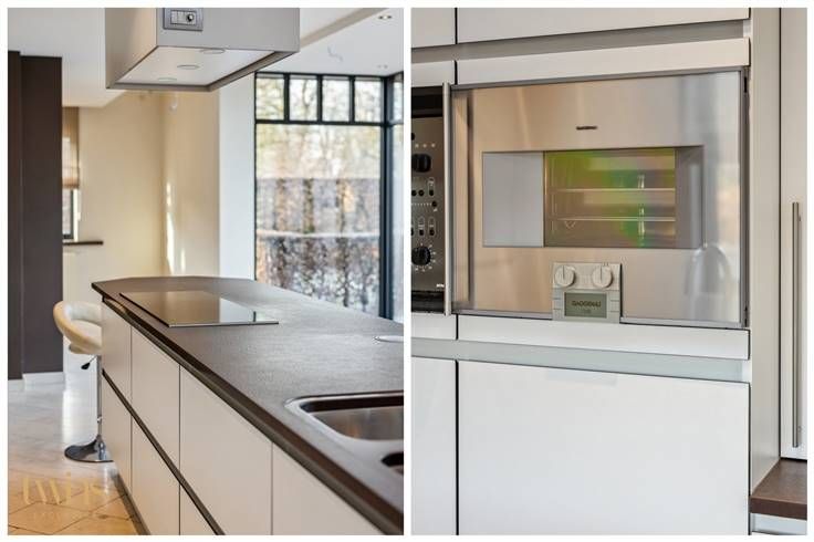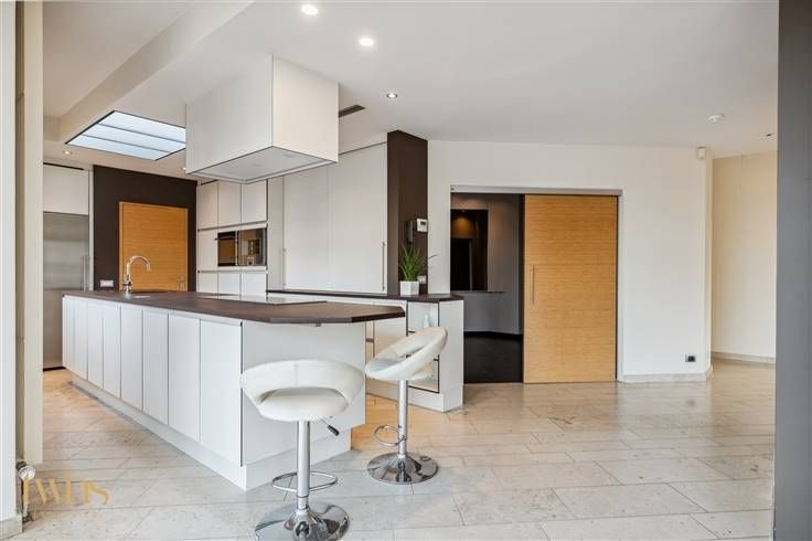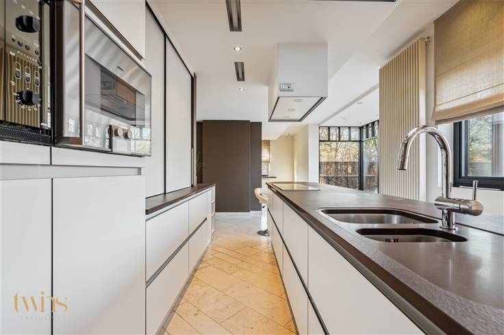 Aansluitend en afgescheiden zijn de privatieven bestaande uit hal-doorloop, apart toilet, woonkamer en zithoek, riante open en modern ogende compleet ingerichte keuken "volkern" met alle aanwezige apparaten (inductie kookplaat, oven, vaatwas, koelkast, stoomoven, ect.) , een bijkeuken met toegang naar de inpandige garage (2-3 wagens), alsook een droge kelder.