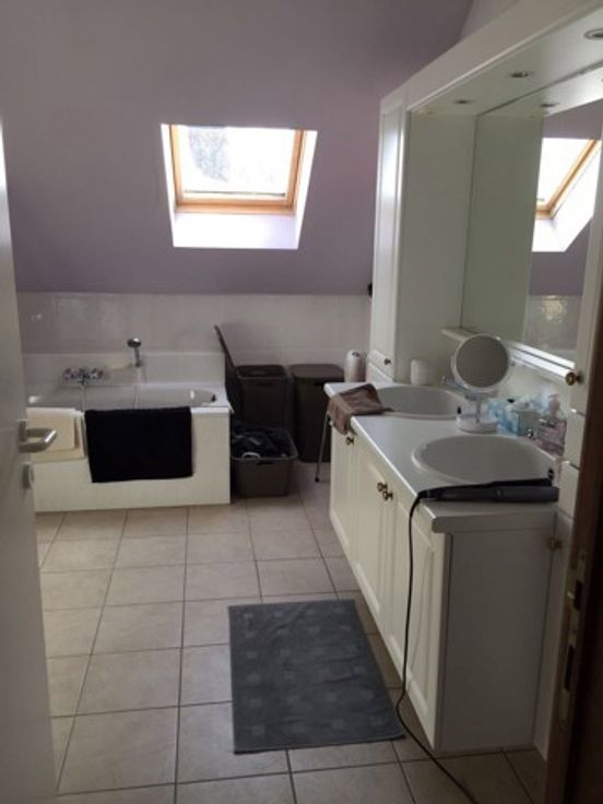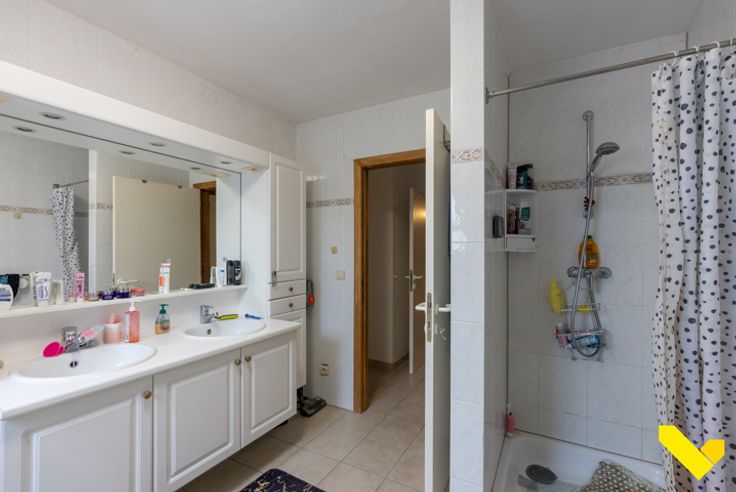 -Een betegelde badkamer (10 m²) met ligbad en aparte douche, groot badkamermeubel met dubbele spoelbakken