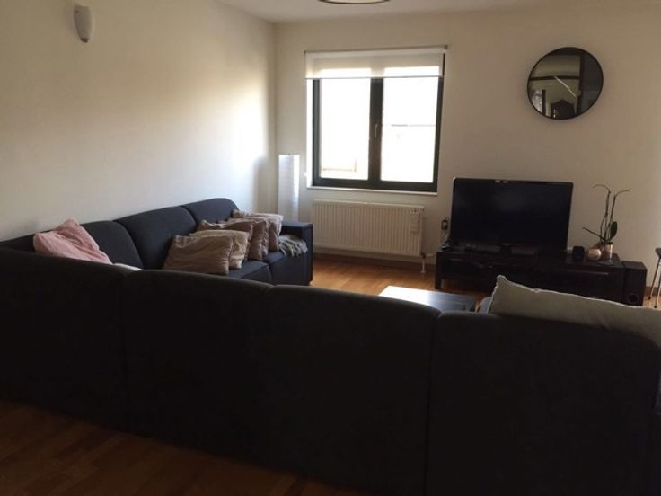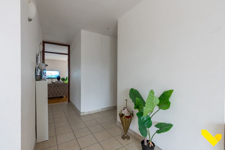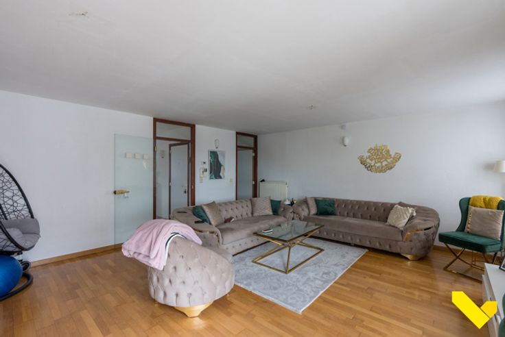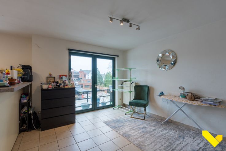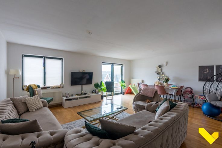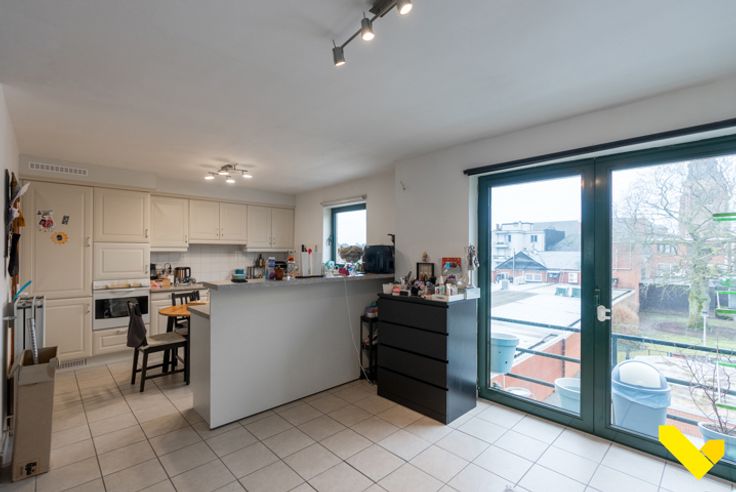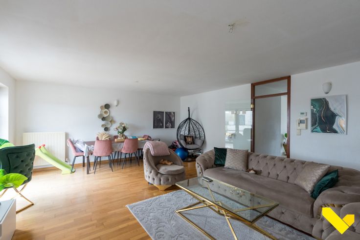 Wij betreden het duplex appartement op de woonverdieping met rechtstreekse toegang tot een ruime, lichte woonruimte, met ook aansluiting tot de keuken.