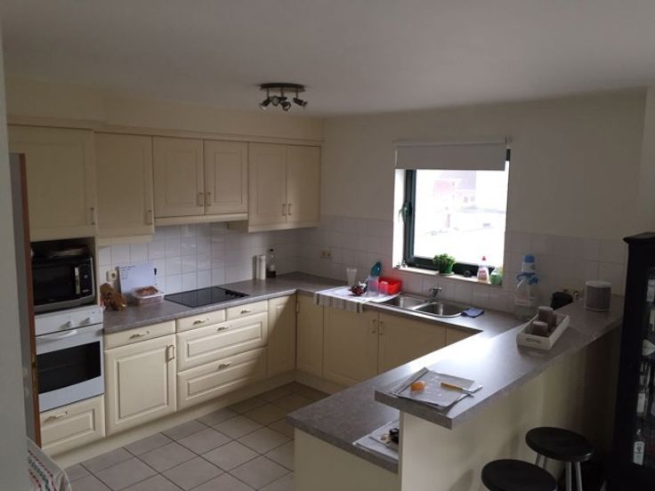 -Een volledig ingerichte keuken (11,7 m² ), in U vorm , (waarvan de kastjes nog vervangen worden) bevat een gecombineerde koelkast -diepvriezer, keramische kookplaat, oven, dampkap, dubbele spoeltafel en een ingemaakte plaats voor de microgolfoven.