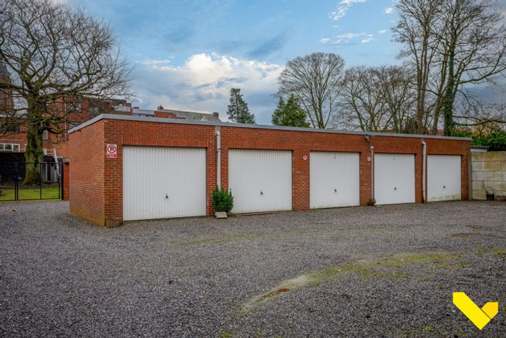 Een grote garage met verlichting is bereikbaar via de doorrit naar het garagecomplex