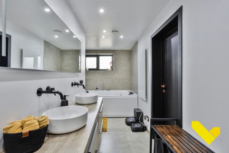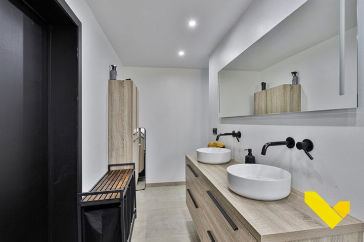 *prachtige badkamer met dubbele lavabo, regendouche en apart bad