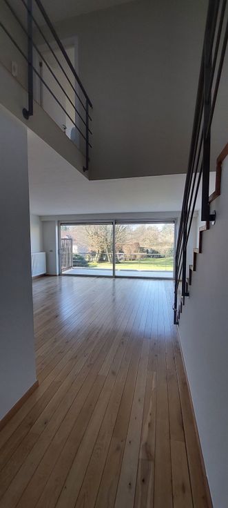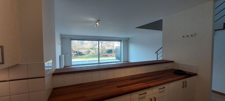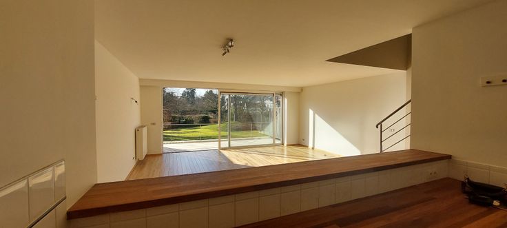 Hall d'entrée avec vestiaire, espace buanderie sous escalier, wc + lave-mains, spacieux séjour (42m²) avec cuisine ouverte(9m²) full équipée (lave-vaisselle, frigo et freezer séparé, cuisson vitrocéramique, four, hotte, micro-ondes grill). Grande baie vitrée vers superbe terrasse orientation OUEST (20m²), vue sur jardin commun magnifiquement entretenu.