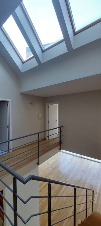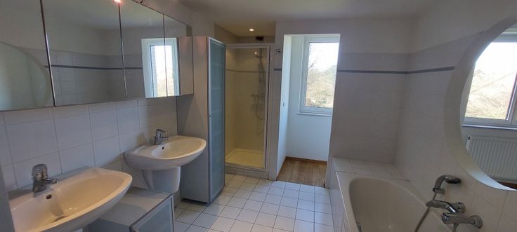 A l'étage, 1 chambre(9m²), wc séparé, salle de douche avec douche, sèche-serviettes et meuble lavabo, grande suite parentale(16m²) avec vue jardin, dressing(6m²), salle de bains avec bain, douche et double vasque et wc.(9m²)