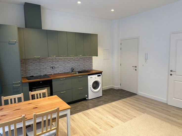 Surface habitable +/-50m2, cuisine équipée (rangements, placards, frigo, taques électriques, four, machine à laver), pas de cave.