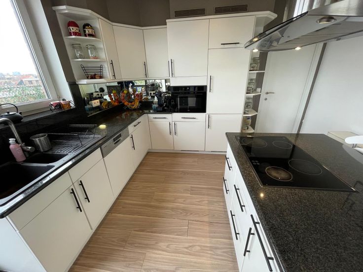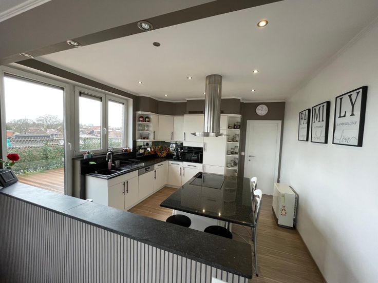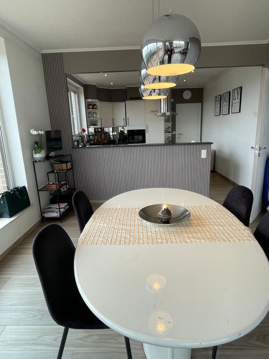 Dit lichtrijke appartement biedt een royale leefruimte, met een open keuken die volledig is uitgerust met een keukeneiland, inductiekookplaat, combi microgolf-oven, afwasmachine, frigo met diepvries.