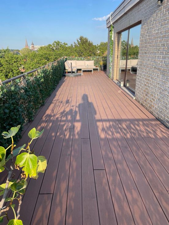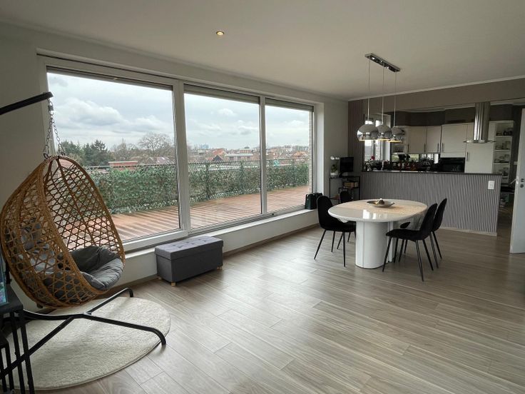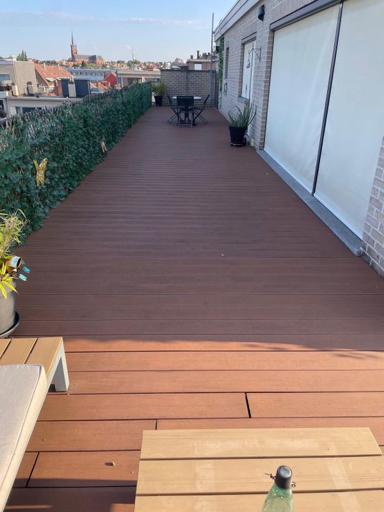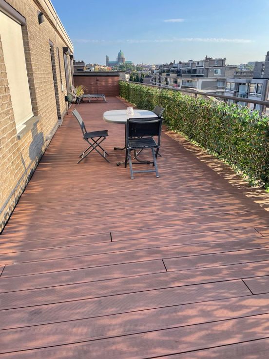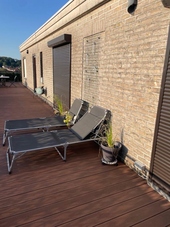 Het prachtige en zeer grote terras van 130m² loopt volledig rond het appartement.