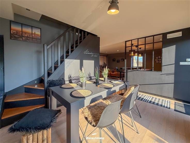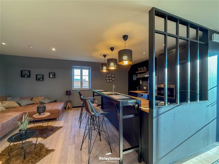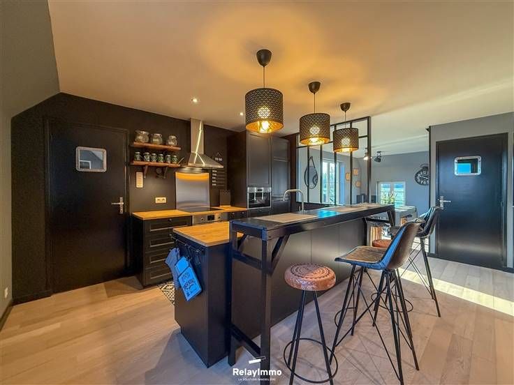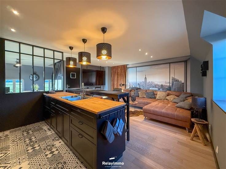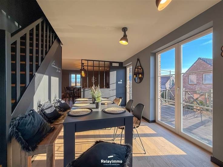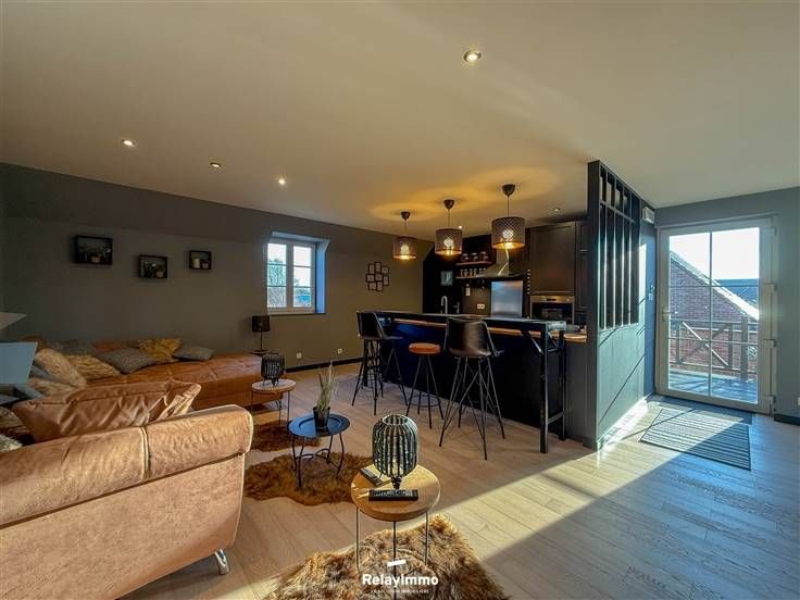 Grote woonkamer met een ontspannende zithoek met enorme aangesloten tv, eetkamer en volledig uitgeruste open keuken (oven, magnetron, elektrische kookplaat, afzuigkap, koelkast, vriezer, veel opbergruimte...), ontbijthoek.